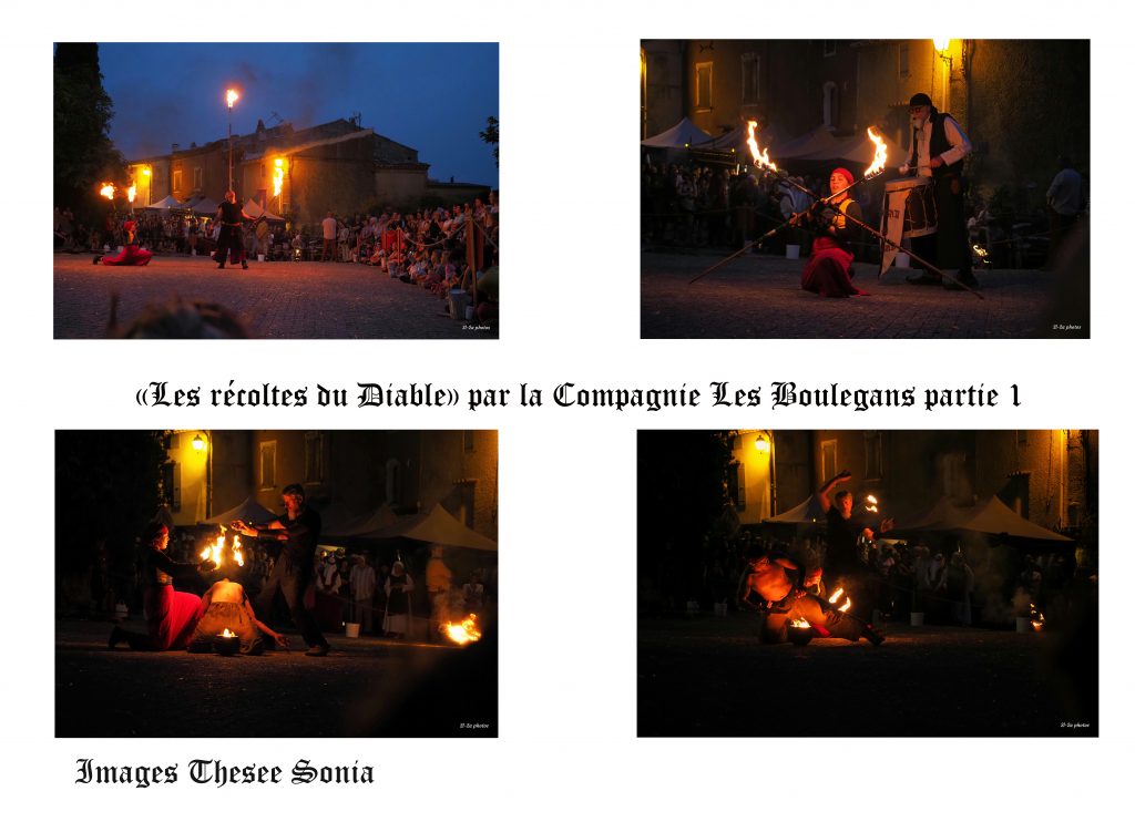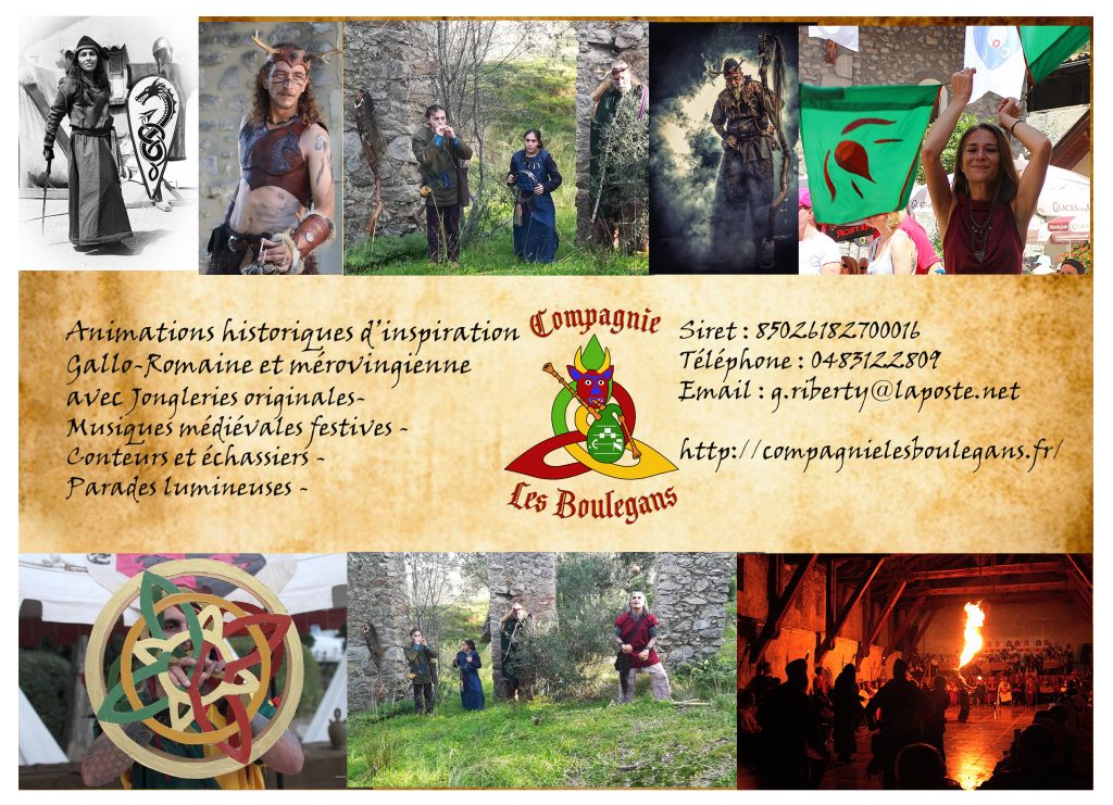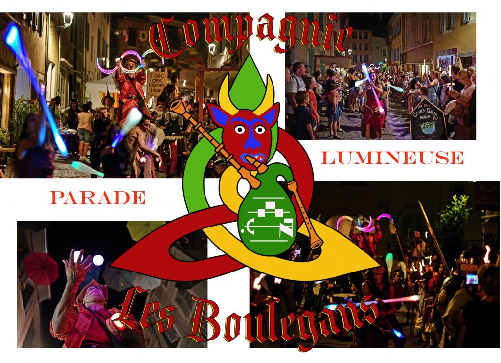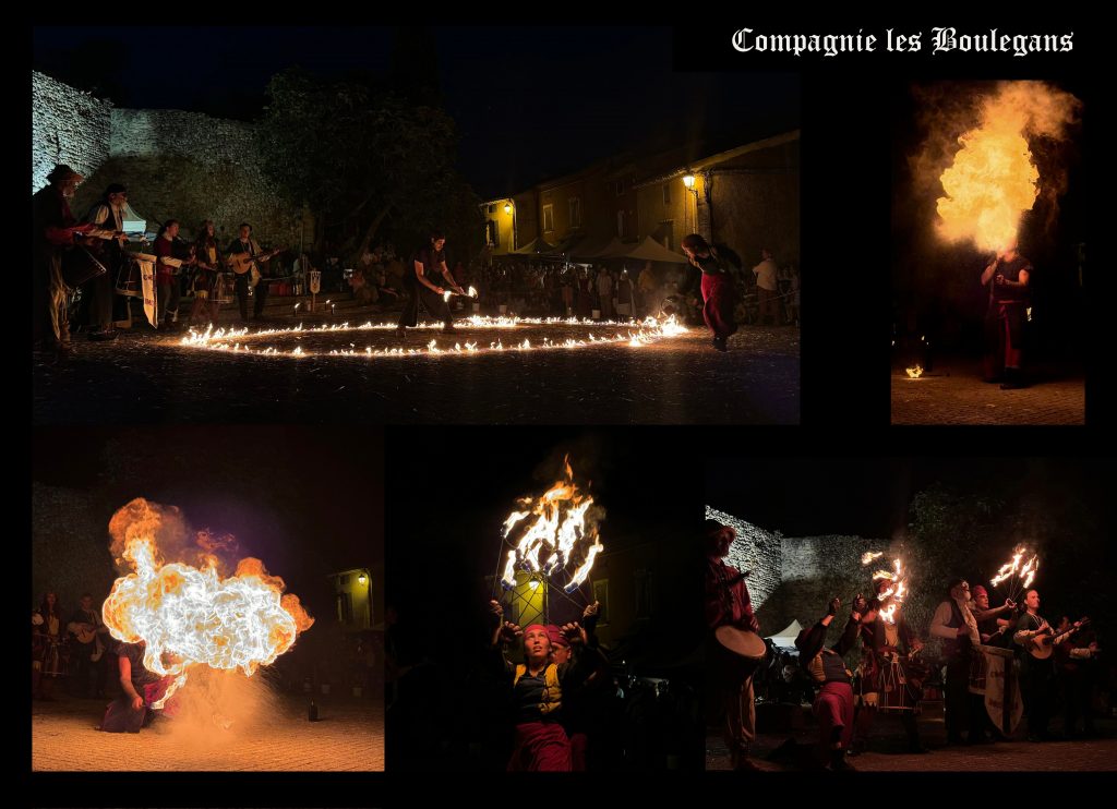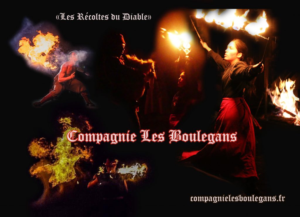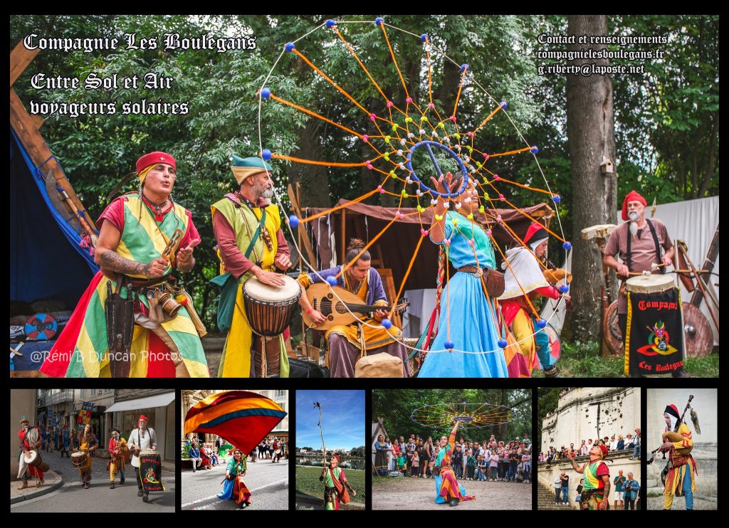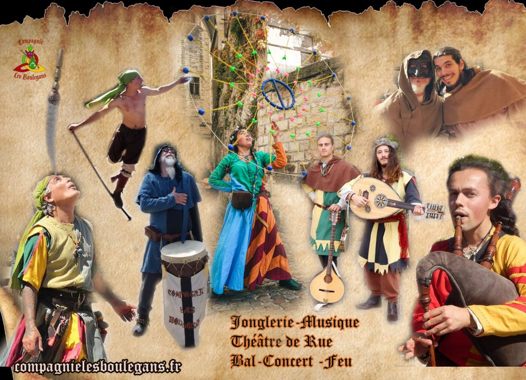 La Compagnie les Boulegans propose des animations musicales festives en costumes historiques colorés, des jongleries originales, un envoûtant et poétique spectacle de feu, ou la formule concert et bal, des fabliaux amusants et des saynètes interactives, dans la tradition des baladins-jongleurs et amuseurs du Moyen-Age. Nous apportons de la joie, de la rêverie et de l’émerveillement, avec nous le public est plus acteur que spectateur. Nos spectacles sont interactifs et participatifs .