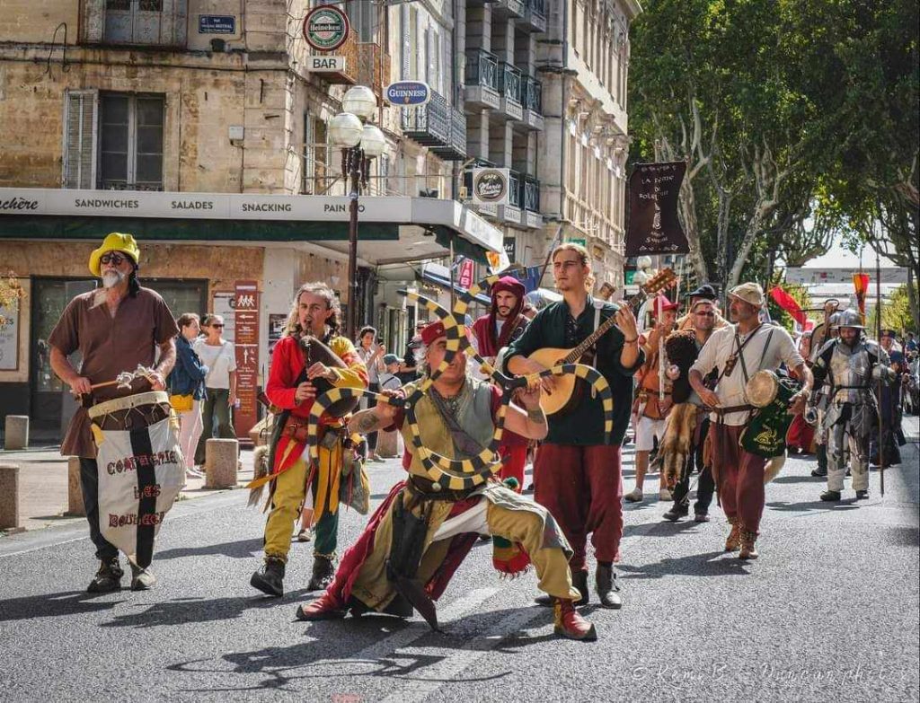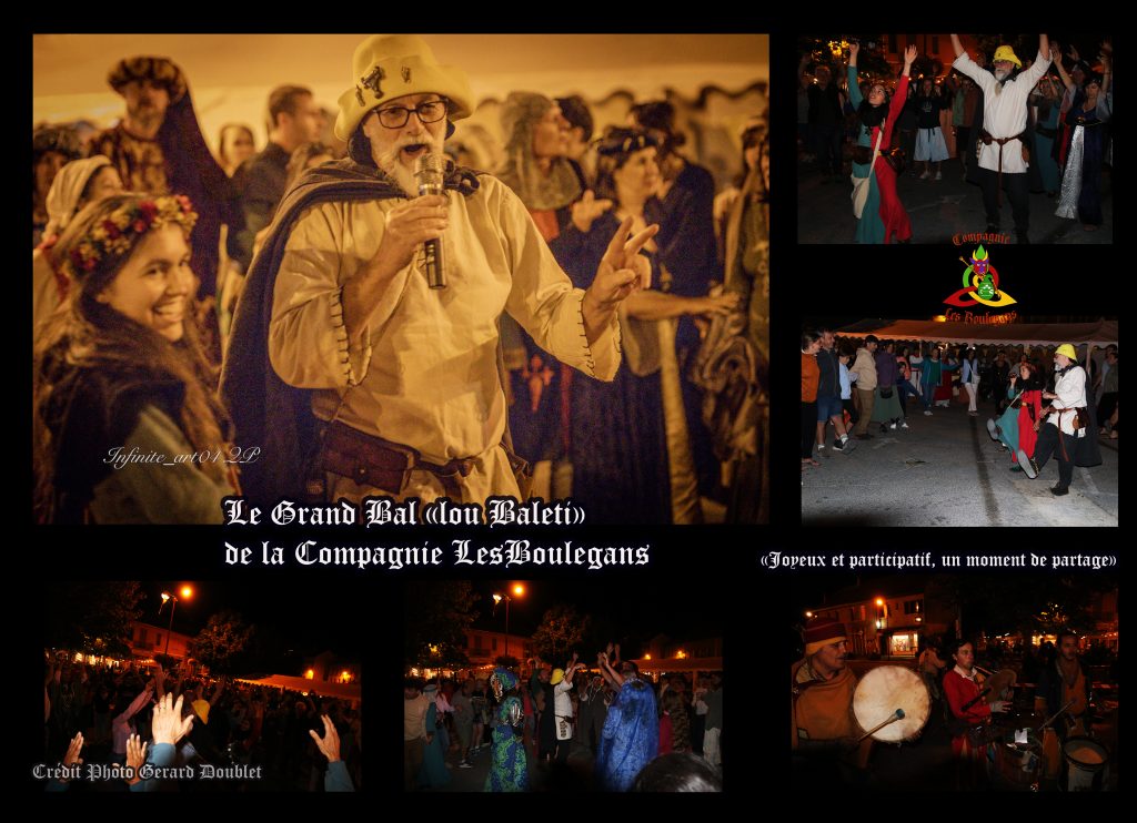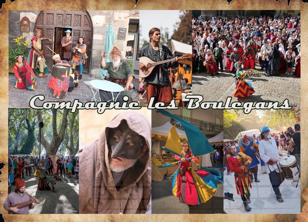 Suivez la farandole des saltimbanques artistes de rue et jongleurs au son frénétique de leur musique endiablée qui vous emporte dans un passé médiéval aux mille couleurs. La cie les Boulegans vous donnera l’envie de participer à l’ambiance festive et émerveillera petits et grands .